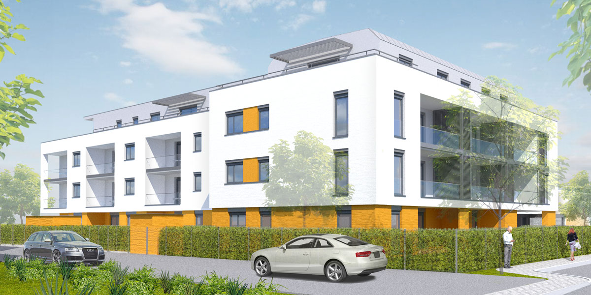 Das Gebäude mit 21 Wohneinheiten besteht aus einer dreigeschossigen hammerartigen Bebauung.